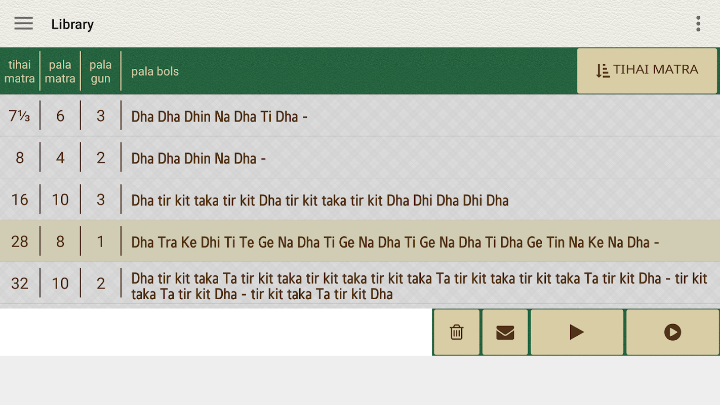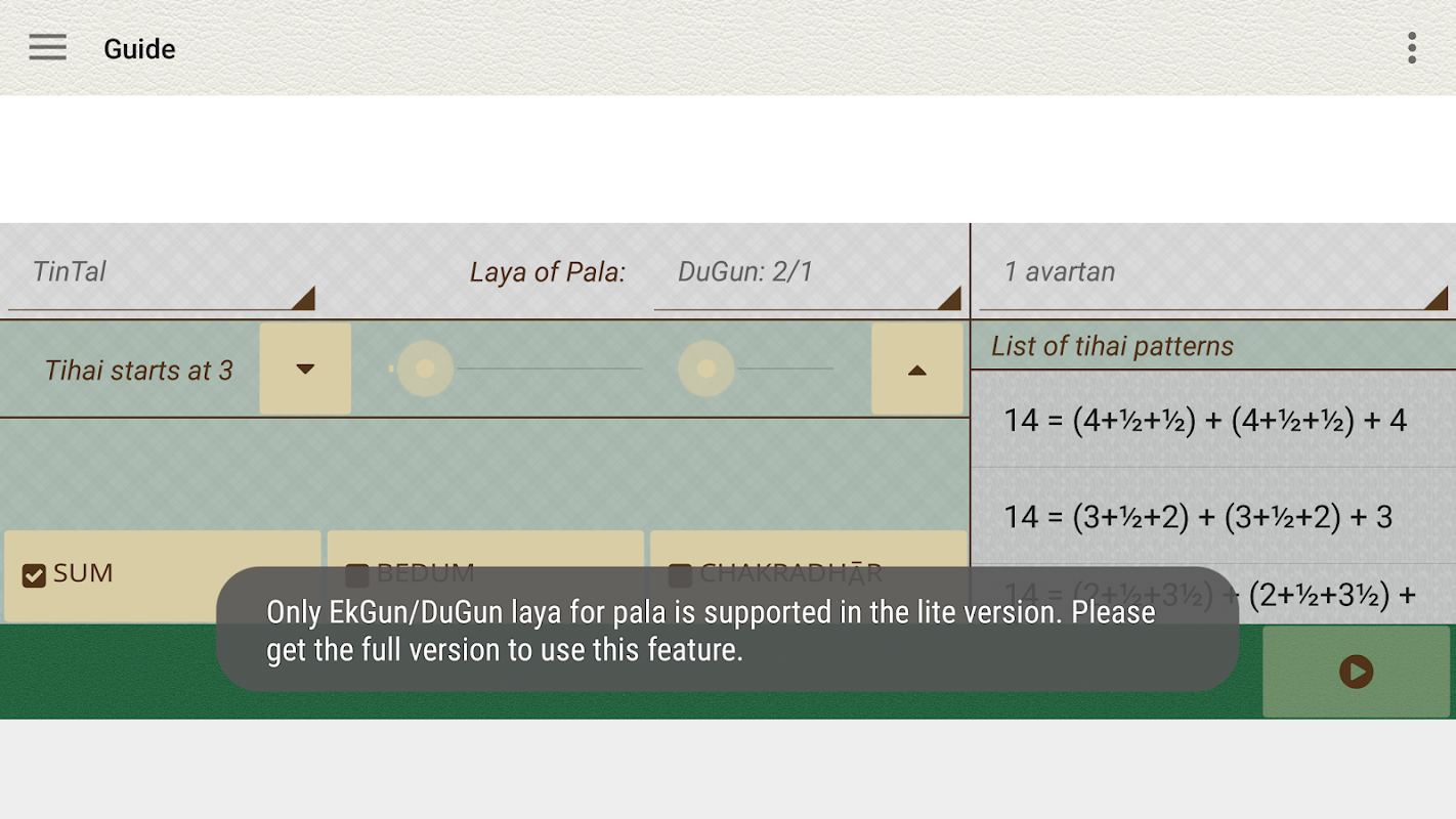 Tihai Shatra Lite ist die Funktion beschränkt, kostenlose Version von TihaiShatra - eine App komponieren und spielen Tihai, in der Regel eine polyrhythmic Phrase verwendet, um ein Stück in Hindustani Musik zu schließen. Eine Tihai Zusammensetzung besteht aus einem pala (mit oder ohne Pause oder Lücke), die dreimal und landet auf der Summe oder zu Beginn des taal wiederholt wird. Die App kann für Kathak / Tabla / Hindustani Vokalgesang der Praxis verwendet werden.