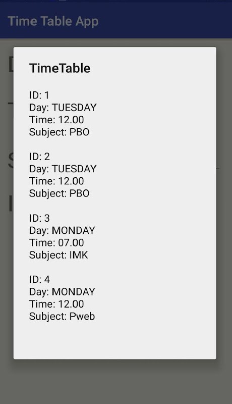 Time Table App merupakan aplikasi untuk mengelola jadwal kelas, dimana pengguna bisa menginputkan jadwal kelas meliputi subjek, waktu dan hari. Aplikasi ini memiliki fitur update data serta fitur untuk menghapus data. Aplikasi ini juga dilengkapi dengan notes apabila pengguna ingin membuat catatan penting.