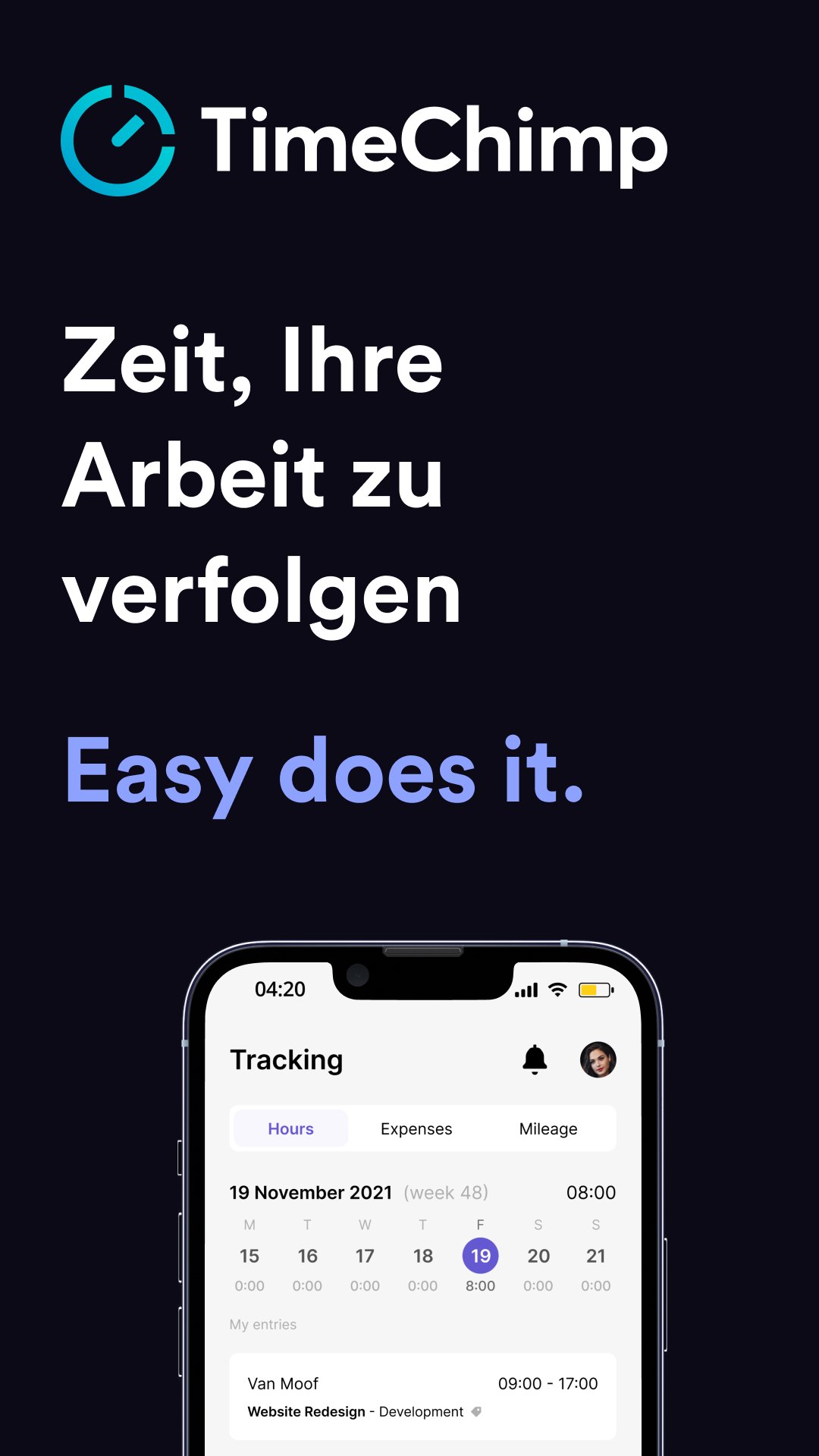 Zeiterfassung muss nicht aufwendig sein. Sie sind ständig beschäftigt, aber nicht produktiv? Vereinfachen Sie zeitraubende Verwaltungsprozesse mit TimeChimp. Tracken Sie Ihren Arbeitstag praktisch am Smartphone. Alle Daten werden sicher gespeichert und sind für Sie jederzeit zugänglich. Easy does it.