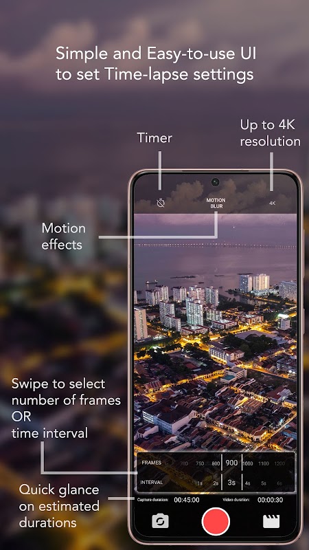 1. Erfassen Sie Zeitraffer mit benutzerdefinierbaren Einstellungen wie Zeitintervall, Anzahl der Bilder, Videoauflösung, Bildrate und Videobitrate.