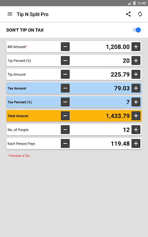 Aufrunden oder Abrunden auf einen beliebigen Wert an der Spitze Taschenrechner und sofort sehen, Änderungen an der Spitze Prozentsatz, Spitze Betrag, Gesamtbetrag und zu zahlenden Betrag pro Person!