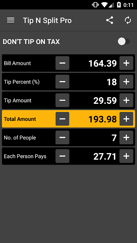 Dieser Tip Calculator App berechnet nicht nur schnell und einfach kippen, sondern auch hilft, um die Rechnung zwischen einer beliebigen Anzahl von Personen aufgeteilt. Sie können wählen, auch nicht auf Steuern zu kippen.