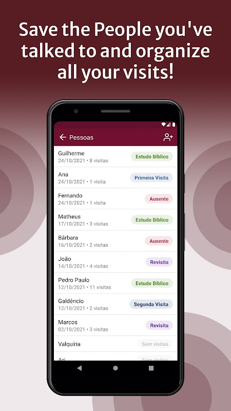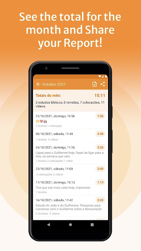 Mit TJ Droid organisieren, planen und verwalten Sie Ihren gesamten Servicebericht. Tool, das erstellt wurde, um Jehovas Zeugen, TJ, in brasilianischem Portugiesisch, bei ihrem Freiwilligendienst zu unterstützen.