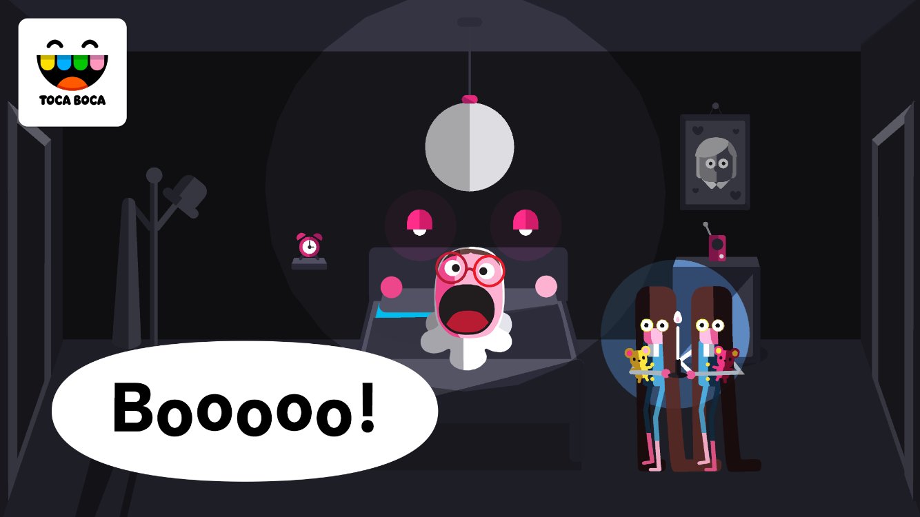 Streife im Haus umher und suche nach der Familie. Verstecke dich unter Tischen, hinter Vorhängen oder sogar Bettdecken. Durchsuche die Zimmer, aber halte dich vor Licht fern, da du sonst gesehen wirst. Klappere mit Gegenständen, wirf den Kessel an und mache die Charaktere nervös! Kannst du ihren Herzschlag hören? Toll, nun ist es an der Zeit für TOCA BOO!