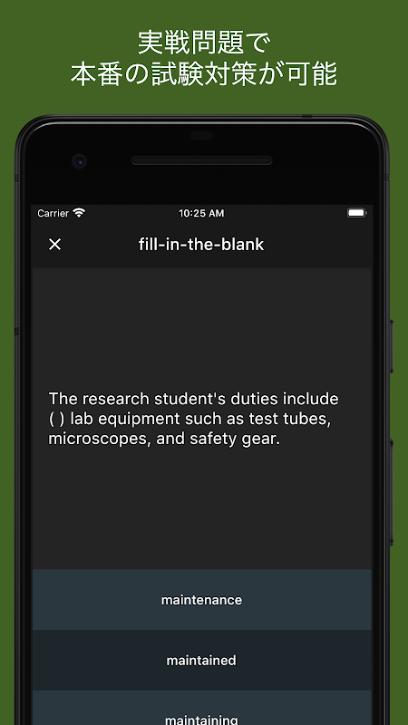 ここでの目的はTOEICライクな英語の文をひたすら読むことです。表示された文がを読めれば◯、読めなければ×を選択してください。単純な作業ですが、分かる文と分からない文を区別することで、自身の語彙力と読解力を確認することができます。問題回答後の詳細画面では日本語訳と共に語彙や文法などの重要項目を解説しています。