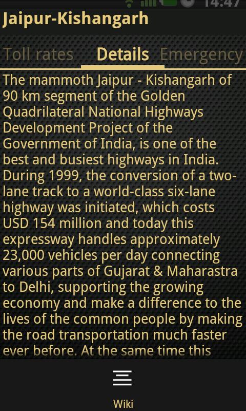 Next screen will display the cost for each plaza for Cars/Jeep, Trucks/Bus and Motorbikes. The settings screen lets you to choose vehicle type for getting toll rates.