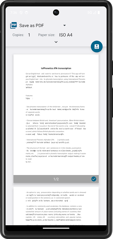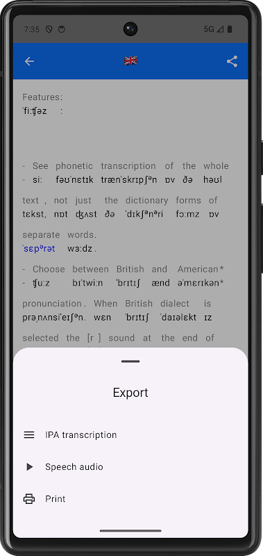 – Drucken Sie Ihre Transkriptionsergebnisse (oder exportieren Sie sie als PDF), entweder nur in IPA oder zusammen mit dem Original.