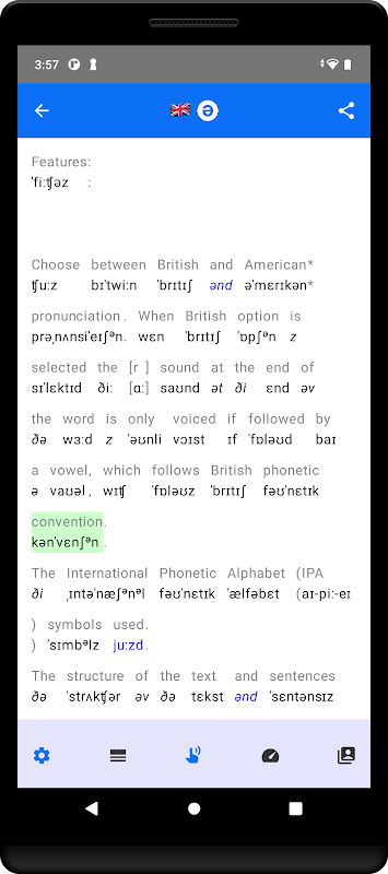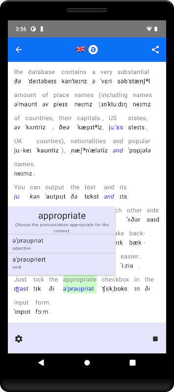 – Wenn ein Wort mehrere Aussprachemöglichkeiten bietet (in der Ausgabe blau hervorgehoben), können Sie durch Antippen diejenige auswählen, die zum Kontext passt.