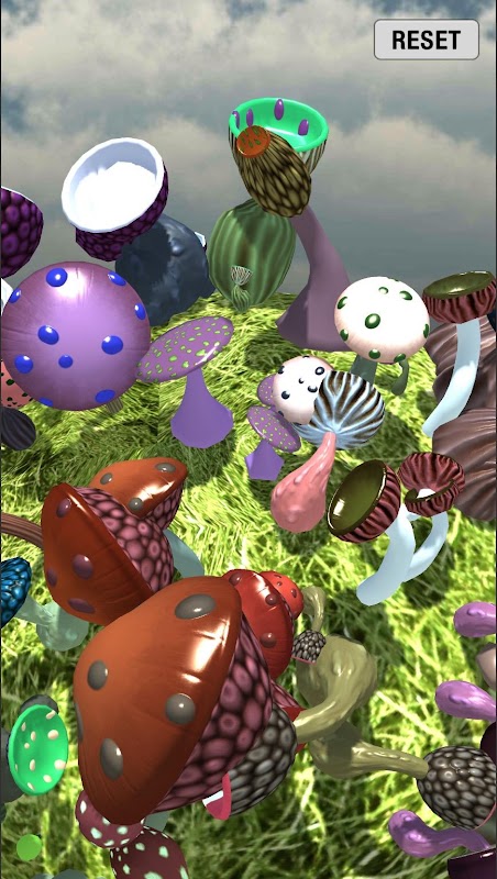 Prozedural generierte 3D-Pilze mit konfigurierbaren Eigenschaften. Wische über den Himmel, um den Minigrasplaneten zu drehen. Berühre den Boden, um einzigartige Pilze hervorzubringen. Wische über den Boden, um eine Spur ähnlicher Pilze zu hinterlassen.