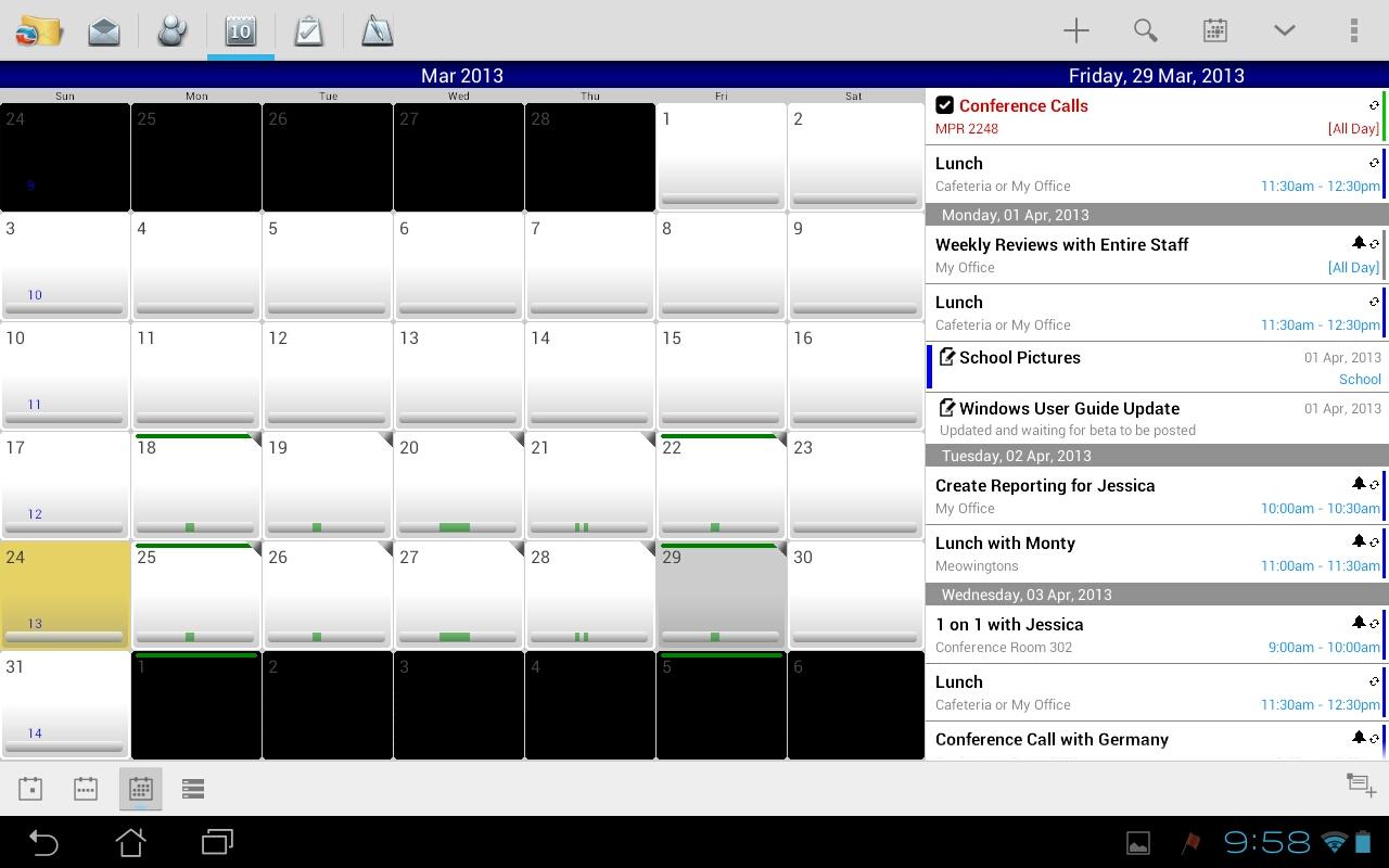 TouchDown HD gets your Email, Contacts, Calendar and Tasks from your corporate Exchange server, and gives you a single tabbed view.