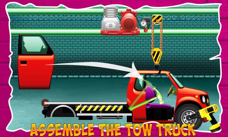 Tow Truck ist fast fertig in Ihrem eigenen verrückten Fahrzeuge Garage, jetzt montieren die polierte Auto Motorhaube, Reifen, Motor und Lichter. Jetzt schmücken Sie die LKW-Auto mit Ihren Lieblings-Aufkleber und Tattoos so viel wie Sie wollen auch. Waschen Sie das Schleppwagen. Ihre maßgeschneiderte und professionelle Dienstleistungen entworfen LKW ist bereit, Verkauf zu sein. Jetzt ist es an der Zeit, diesen Abschleppwagen an den Kunden zu liefern. Glückwunsch kleine Handwerker und verrückte Auto-Erbauer Sie haben eine tolle Arbeit noch einmal gemacht.