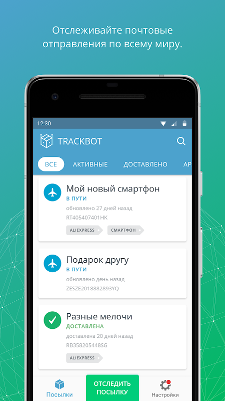Экономьте время на регулярных проверках местоположения посылки и не пропустите её поступление в ваше почтовое отделение с приложением для Trackbot.ru.