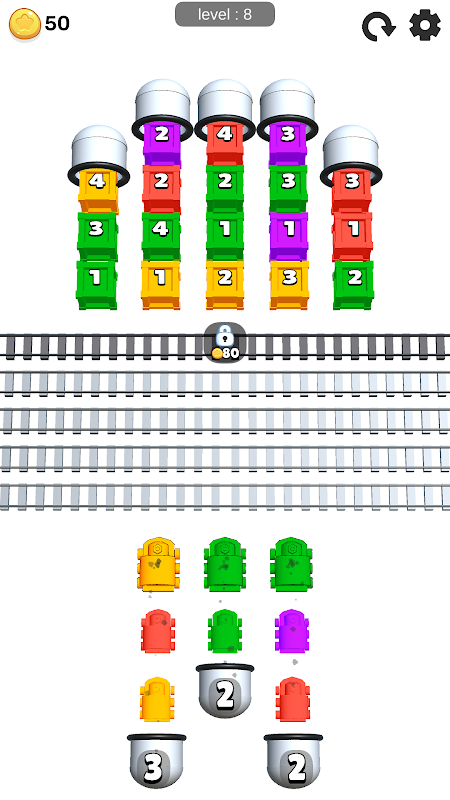 - Tippe auf einen Zug in der ersten Reihe, um ihn auf ein leeres Gleis in der Mitte zu bewegen.