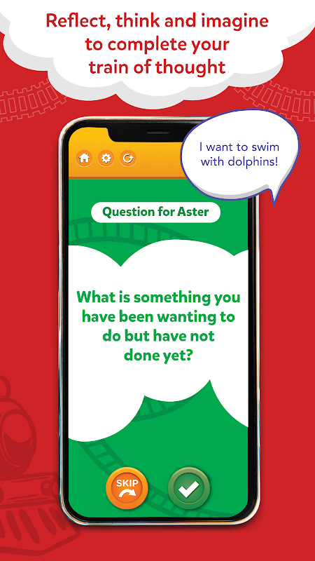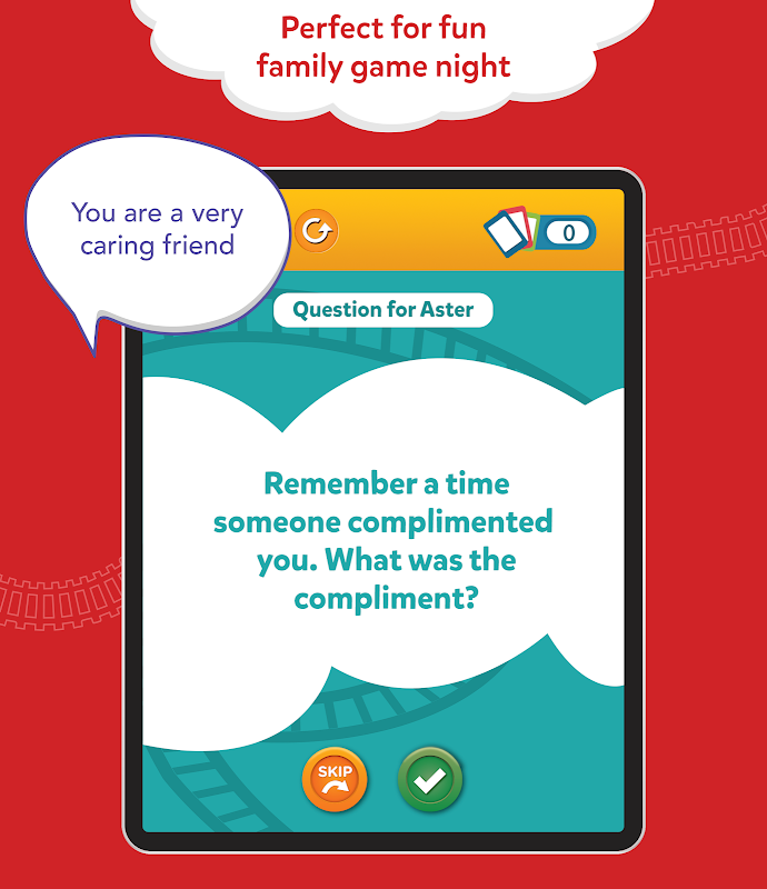 Train of Thought ist ein unterhaltsames Lernspiel für Kinder jeden Alters - Baue emotionale Verbindungen auf, indem du durchdachte Fragen stellst und beantwortest und unterhaltsame Herausforderungen mit diesem einfach zu erlernenden Kartenspiel meisterst!