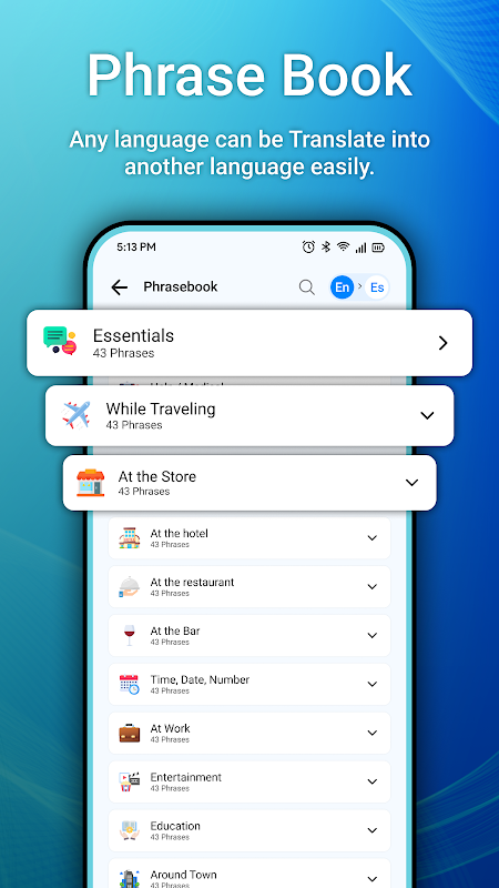 Mit der Phrasebook-Funktion können Benutzer wichtige Phrasen speichern und organisieren, um schnell darauf zugreifen zu können. Es ist perfekt für Reisende und Sprachlernende, da es ihnen ermöglicht, häufig verwendete Ausdrücke zu speichern, zu kategorisieren und erneut aufzurufen, wodurch jederzeit eine reibungslose Kommunikation in verschiedenen Sprachen gewährleistet ist.