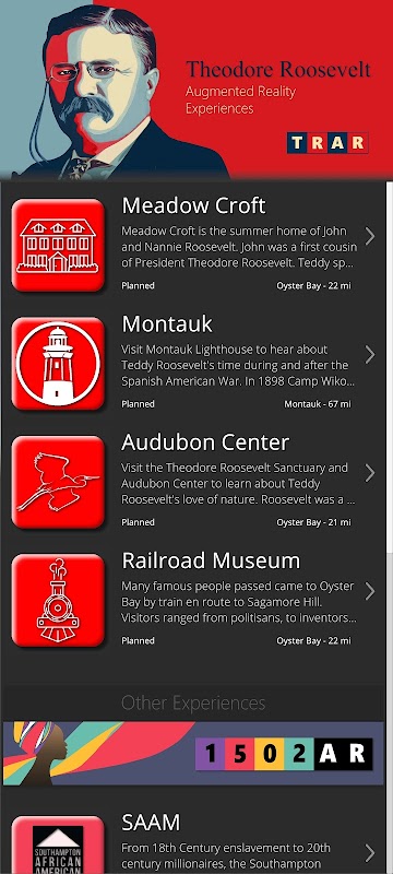 TRAR ist eine Augmented-Reality-App, die ansprechende visuelle und akustische Erlebnisse bietet und es Benutzern ermöglicht, Orte von historischer und kultureller Bedeutung für Theodore Roosevelt zu erkunden. Jeder in der Anwendung enthaltene Standort bietet dem Benutzer ansprechende Inhalte über die Website und darüber, wie unsere lokalen Institutionen die American Journey reflektiert und beeinflusst haben.
