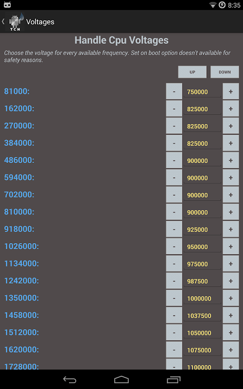 Check the next tab CONTROL CPU in Trickle Cpu Handler. You are free to change the min & max frequencies, also you can save this frequencies and use these when you want. Choose your favorite governor and check how works between min & max frequencies.