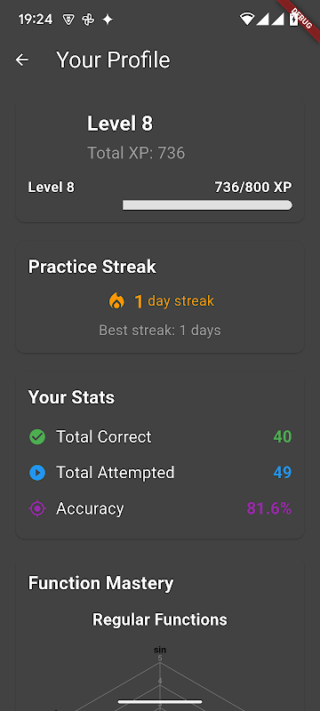 Meistern Sie trigonometrische Verhältnisse durch engagiertes Üben! TrigMaster verwandelt das Auswendiglernen von Sünde, Cos, Tan und ihren Cousins von mühsam in triumphierend. Verbessern Sie Ihre Fähigkeiten, schalten Sie Erfolge frei und beobachten Sie, wie Ihre Meisterschaft auf dynamischen Radardiagrammen wächst. Erlernen Sie die Trigonometrie von Grundwinkeln bis hin zu Umkehrfunktionen, Verhältnis für Verhältnis. Üben Sie überall, verfolgen Sie Ihre Fortschritte und werden Sie ein echter TrigMaster!