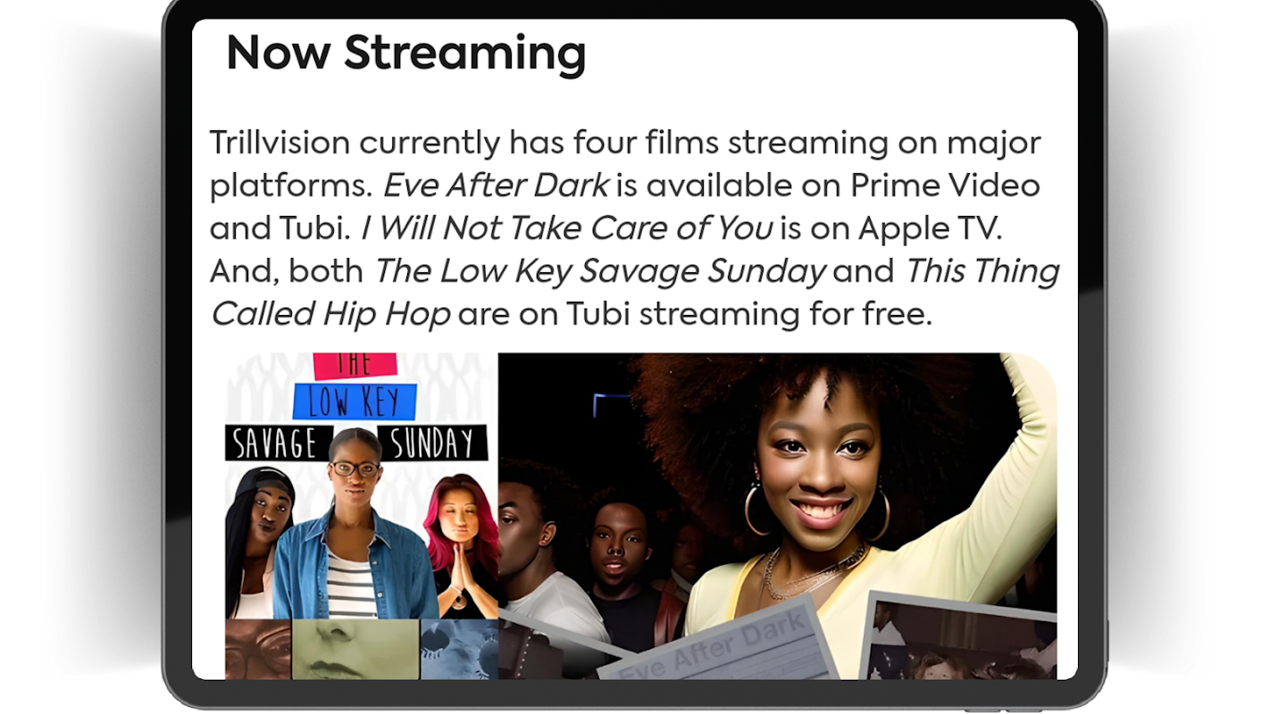 Mit einem Fokus auf urbane zeitgenössische Medien, emotionales Wohlbefinden und integratives Storytelling hat die Marke TRILLVISION preisgekrönte Inhalte produziert, die das konventionelle Filmemachen herausfordern und gleichzeitig neue Künstler und neue Erfahrungen einbeziehen. Von großen Streaming-Diensten und Filmfestivals bis hin zu Live-Stream-Events und Podcasts – unsere inspirierenden Inhalte sind kostenlos und auf Abruf verfügbar. Zusätzlich zu unserer Originalunterhaltung kuratiert die TRILLVISION-App auch Film- und Fernseh-Streaming-Guides, um Benutzern dabei zu helfen, hochwertige Inhalte auf allen wichtigen Streaming-Plattformen zu finden. Laden Sie die App herunter und entdecken Sie, wer und was als nächstes in der Welt der vielfältigen und umfangreichen digitalen Inhalte ansteht.
