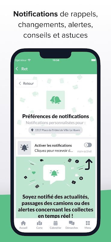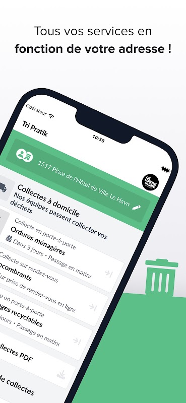 🔔 Bleiben Sie informiert: Die Anwendung bietet personalisierte Echtzeitinformationen zu Fahrplanänderungen oder Schließungen von Recyclinghöfen, Verschiebungen von Abholungen an Ihrer Adresse oder besonderen Maßnahmen von Le Havre Seine Métropole.