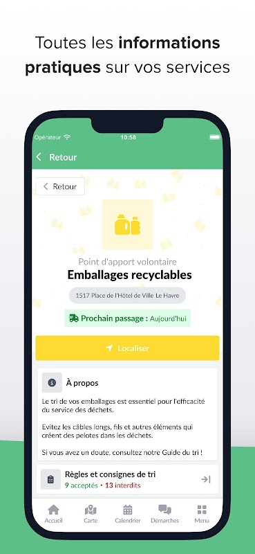 ♻️ Wohin spenden? Wo und wann entsorgen? Wie können Sie Ihren Sondermüll recyceln? Die Anwendung listet Ihnen mittels Geolokalisierung die nächstgelegenen Sammelstellen auf und gibt Ihnen die Regeln und Hinweise zur Sortierung von Glas, Lebensmittelabfällen, Haushaltsabfällen, Verpackungen und Textilien. Sie erfahren, wo Sie spenden können, wie Sie Kompostierungsmöglichkeiten wählen und was Sie mit Batterien, Medikamenten usw. tun können. Und schließlich müssen Sie sich auch keine Gedanken mehr über die Öffnungszeiten der Recyclinghöfe machen: Die richtigen Informationen finden Sie in der Anwendung!