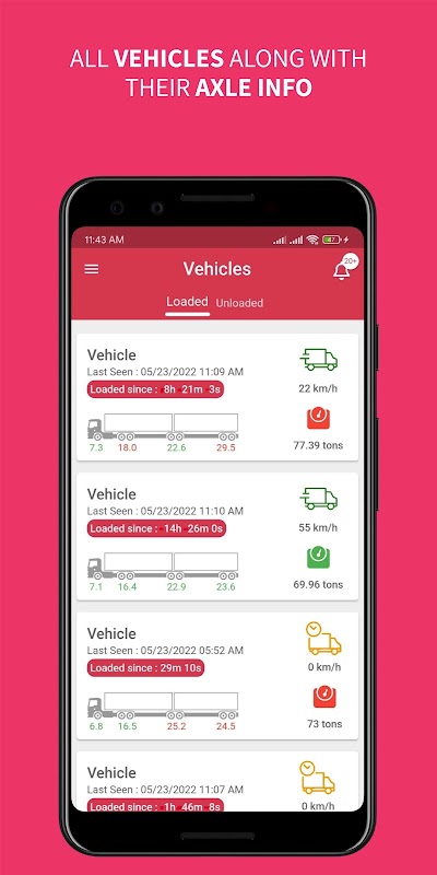 - Zeigt alle Ihre Fahrzeuge Standort und Gewicht in Echtzeit an.