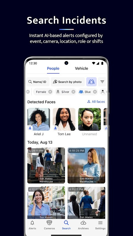 - Sofortige KI-basierte Warnungen, die nach Ereignis, Kamera, Standort, Rolle oder Schicht konfiguriert sind;