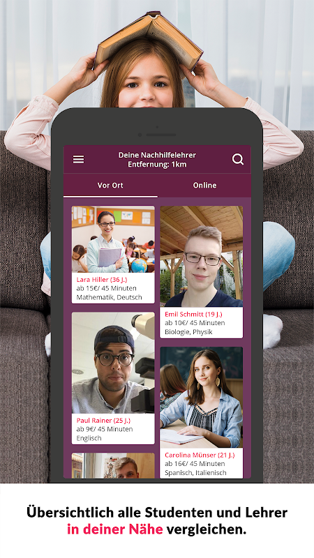 👨🎓 Entdecke spielend einfach die Unterrichtsmöglichkeiten in deiner Nähe. Du suchst Mathe Nachhilfe? Dann filtere nach Mathe und Entfernung und du hast alle Preise, das Alter und den Nachhilfelehrer generell in einer Übersicht, um sie zu vergleichen.