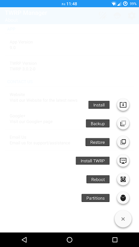 Mit dieser App können Sie Ihr Gerät mit TWRP installieren, sichern, wiederherstellen und löschen. Wir verwenden OpenRecoveryScript, um diese Aktionen abzuschließen. Ihr Gerät wird in TWRP neu gestartet, führt die ausgewählten Aufgaben durch und führt dann einen Neustart auf Android durch. Alle Probleme oder Fehler innerhalb der Wiederherstellung sollten mit Team Win behoben werden. Wir machen keine Wiederherstellung und können nichts über unsere Apps hinaus unterstützen.