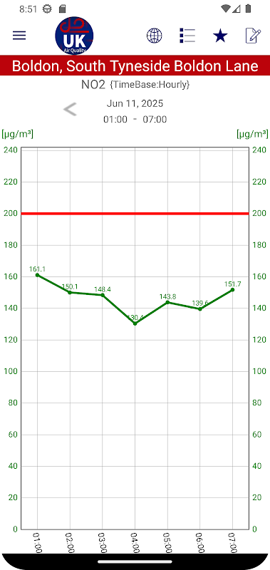 Durch die Auswahl der Bedarf können Sie Diagramme, die zeigen Ihnen heute 30 min erzeugen Schadstoff. Werte von Mitternacht bis jetzt nach Großbritannien Air Qualitätsstandard oder ein tägliches Durchschnittswerte für den aktuellen Monat bezogen. Für die beiden Diagrammen können Sie Seite vor oder zurück zur vorherigen Tag oder Monat anzuzeigen.