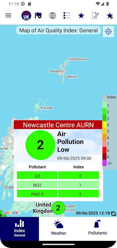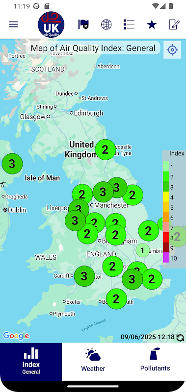 Die Anwendung berechnet die Luftqualitätsindex basierend auf UK Standards.