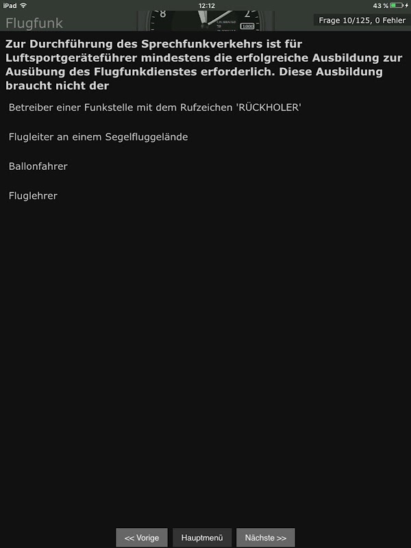 Hinterlegt ist der komplette aktuelle Fragenkatalog nach DAeC und DULV, so wie er als Multiple Choice Test in der Prüfung zum Einsatz kommt.