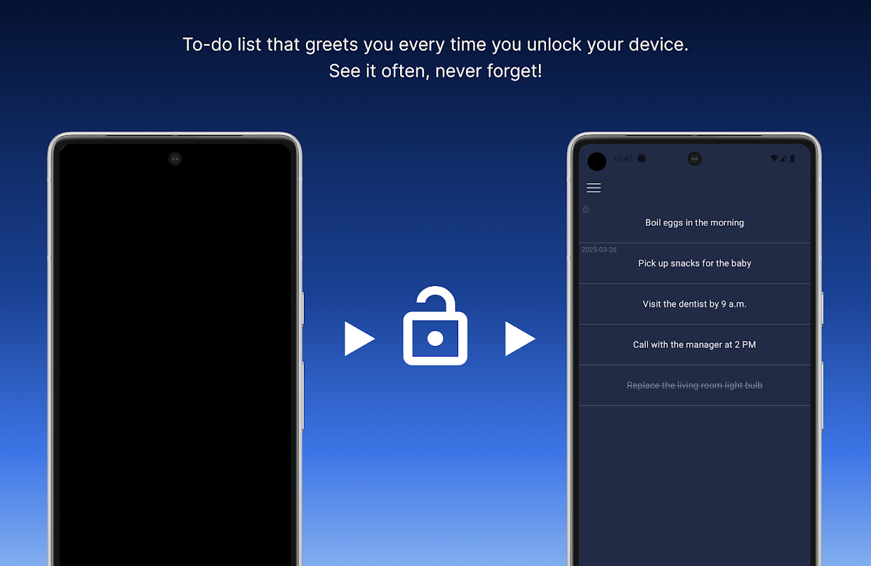 Es soll Ihnen helfen, nie etwas zu vergessen – nicht durch das Versenden endloser Benachrichtigungen, sondern durch die stille Anwesenheit, sobald Sie auf Ihr Telefon schauen. Ganz gleich, ob es sich um eine kleine Erinnerung oder etwas wirklich Wichtiges handelt, UnforgetTodo stellt sicher, dass nichts untergeht.