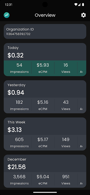 - Sehen Sie, was Sie verdienen: Verschaffen Sie sich einen klaren Überblick über Ihre täglichen, wöchentlichen, monatlichen und jährlichen Einnahmen aus In-App-Werbung.