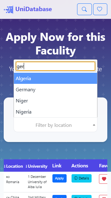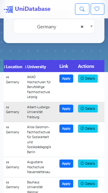 Die umfassende Hochschulbewerbung umfasst mehr als 9300 Hochschulen, inklusive Ranking-Details, einem direkten Link zur Anmeldung und direkter Kommunikation mit der Hochschule per E-Mail sowie den Bewerbungsbedingungen für internationale Studierende und der Hochschuladresse über die Karte.