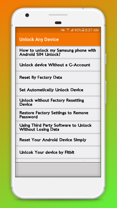 This app provides guide to unlock any android devices and others. Unlock any device by remove password, Hard reset, unlock without account and much more features. Everyone needs to secure data or preventing unauthorized use of his data in this modern era. One method to protect your phone data is to lock your phone screen by pattern, pin or in other way like face recognition. This app provide guide to solution of problems of device locking or unlocking. Easy Unlocking Guides Process Explained.