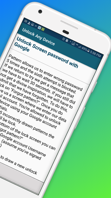 Unlock any device guide to protect and secure data. Everyone needs to secure data or preventing unauthorized use of his data in this modern era. One method to protect your phone data is to lock your phone screen by pattern, pin or in other way like face recognition. This app provide guide to solution of problems of device locking or unlocking. Easy Unlocking Guides Process Explained.