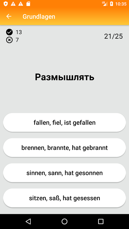Приложение позволяет повторить старые или изучить новые неправильные глаголы немецкого языка. Изучение проходит в виде тестов, распределенных по уровням владения языком, в которых нужно выбрать правильные ответы.