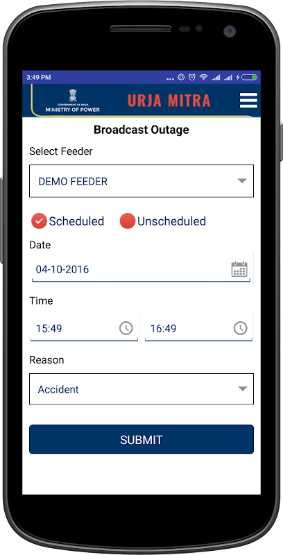 Außerdem stellt es Pan-India integrierte Mobile Anwendung für Android und iOS-Plattformen, den Bürger zu ermöglichen, in Echtzeit und historische Ausfallinformationen für Discoms zugreifen zu können. "Und Benachrichtigungen Plattform zur Ableitung der Ausfall Informationen zu Energieverteilung der Verbraucher in ganz Indien durch SMS / Anrufe / Push Benachrichtigungen.