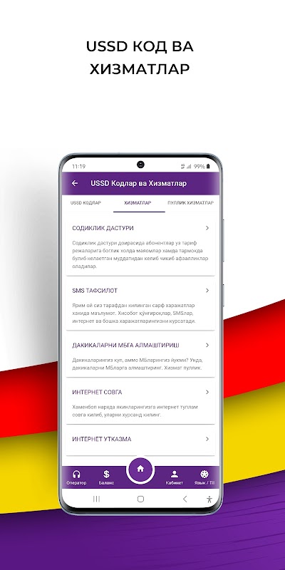 Die O'zbekistonda kann Ihnen helfen, einen anderen Betreiber zu erreichen (Mobile [UMS], UzMobile und andere) USSD-Dienste. Ilovadan foydalanib, siz hozirda telefon raqamingizga qaysi pullik xizmatlar yoqilganligini ko'rishingiz, ularni o'chirishingiz yoki qo'shimcha hizmatlarni yoqishingiz mumkinligini, hamda mavjut bo'lgan Bonus daqiqalarni tekshirishingiz mumkin.