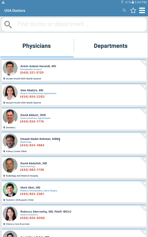 The UVA Doctors app allows you to keep all the University of Virginia doctors and providers on your phone for ease of access and reference.