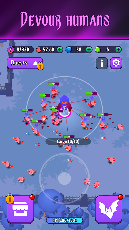 Tauche ein in eine unbeschwerte, düstere Fantasy-Welt in Vampire Feast, einem Idle-RPG. Spiele als Duskaris, ein höherer Vampir, der aus dem heimtückischen Dungeon-Labyrinth von Velgrimor entkommen will. Gefangen vom legendären Jäger Van Helping, muss Duskaris Feinde jagen, ihre Seelen aussaugen und an Macht gewinnen, um sich zu befreien. Wirst du deinen Entführer überlisten und die Monster in die Freiheit führen?