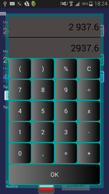 Durch das Taschenrechnersymbol drücken, wird der Rechner angezeigt und Sie können berechnen, dann werden Sie zwei Displays sehen Sie sehen das Ergebnis entweder mit dem eigenen Formatierung numerischer, die Sie aus den Einstellungen bearbeiten können, oder ohne numerische Formatierung aber mit Ihrer Berechnung Details. Sie können sogar kopieren Sie die erste und die zweite Anzeige durch einen langen Druck auf die Zwischenablage. Es ermöglicht Ihnen, Ihr Land Preise zu verwalten, indem die Plus-Taste drücken, können Sie mehrere benutzerdefinierte Prozentsätze leicht hinzufügen oder löschen.