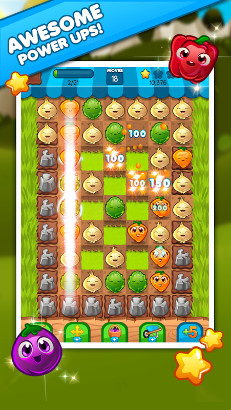 - Boost your score with potent power-ups like the Bomb, Basket and Wheelbarrow. Earn three stars on every level!