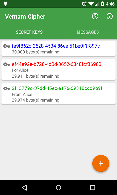 Mit dieser App können Sie geheime Schlüssel erstellen und freigeben, die Sie dann zum Ver- und Entschlüsseln von Nachrichten mithilfe der Vernam-Verschlüsselung verwenden können. Diese Implementierung dient als One-Time-Pad, da der Teil des Schlüssels verworfen wird, der zum Verschlüsseln / Entschlüsseln von Nachrichten verwendet wird.