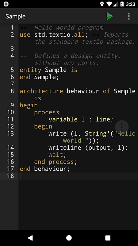 Schreiben Sie VHDL-Code direkt auf Ihrem Android-Gerät! Diese App ist ideal zum Lernen und Testen von Codefragmenten!