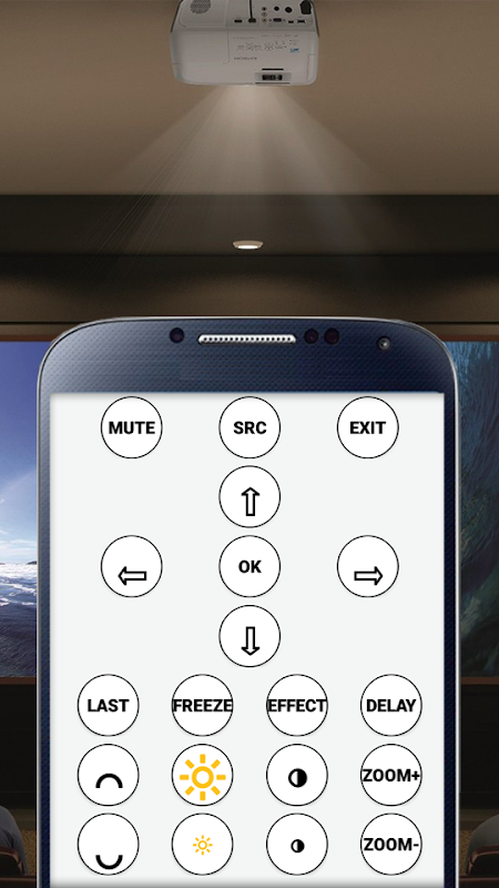 Once you powered your projector, press the buttons on your phone while aiming it at your projector. The IR Video Projector Remote is great for replacing your old controller