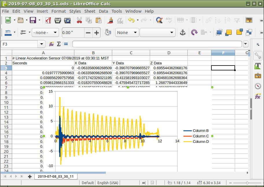 Note that the data is returned by the device to the SensorUtils application asynchronously. The device will return the data at the rate that it sees fit in order to let other applications perform properly. SensorUtils may be interrupted by an incoming call or an user action -- if the SensorUtils application is off the screen any recording in progress in be saved and the application will release any requests for sensor data. Users also need to consider that other applications make use of the sensors. The effect of this is that the rate that SensorUtils receives updates decreases, perhaps significantly.