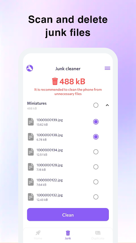 ✨ Geben Sie mit einem Klick Speicherplatz frei. Das elegante Lila-Thema verleiht der Reinigung ein Gefühl von Ritual