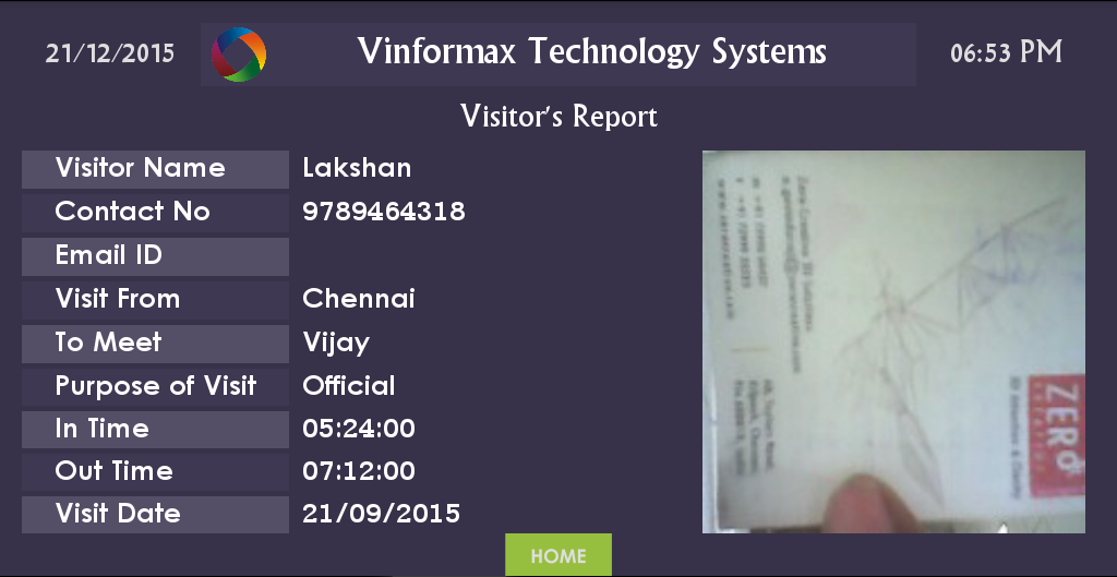 - Capturing the Business card photo of Visitors coming with Business cards or Visitors photo if they don't have business card